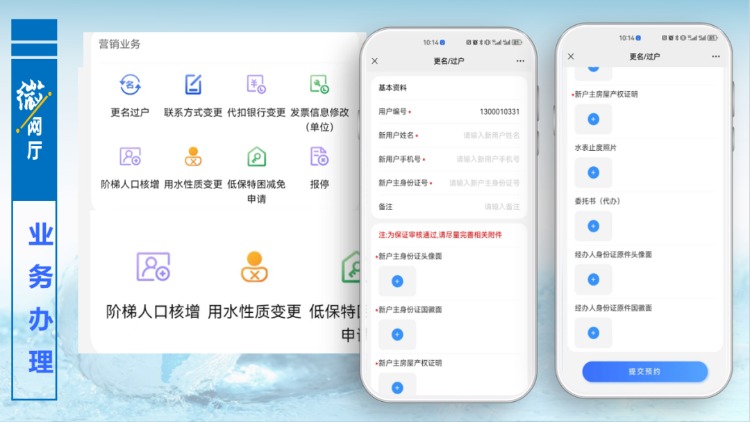 當(dāng)用水施工完成,達(dá)到通水條件,用戶同樣可在“微網(wǎng)廳”中,辦理驗(yàn)收通水申請(qǐng),填寫(xiě)相關(guān)信息,上傳附件,提交預(yù)約,后臺(tái)工作人員會(huì)主動(dòng)聯(lián)系用戶,進(jìn)行驗(yàn)收通水。